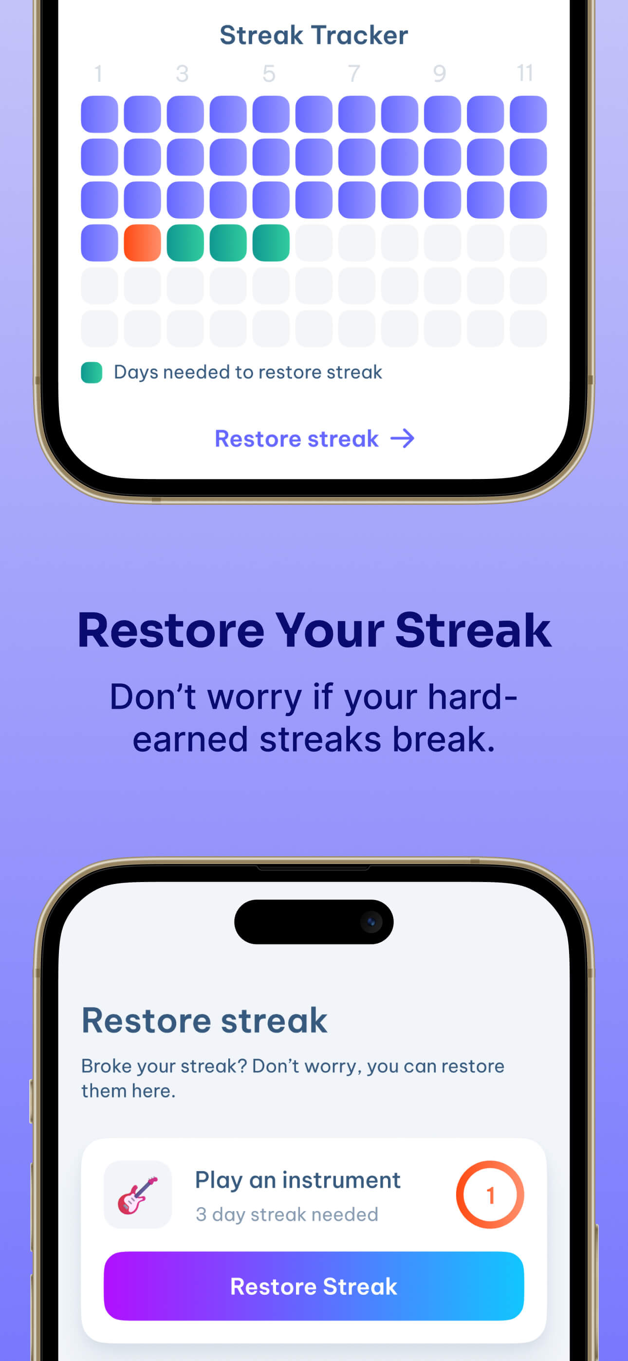 Missed a day? No worries! Restore your hard-earned streaks and keep moving forward without added stress.